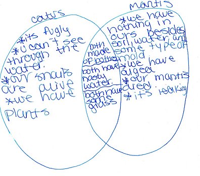 We learned about the praying mantis and how it lives. And we learned that you can make a whole ecosystem out of soda bottles. By observing the ecobottle, we learned how the whole ecosystem works, and how one thing can affect everything in the ecosystem. One thing that surprised us is how long the praying mantis lived because it had no food. We thought it would die sooner, but it lived two times longer than we predicted.